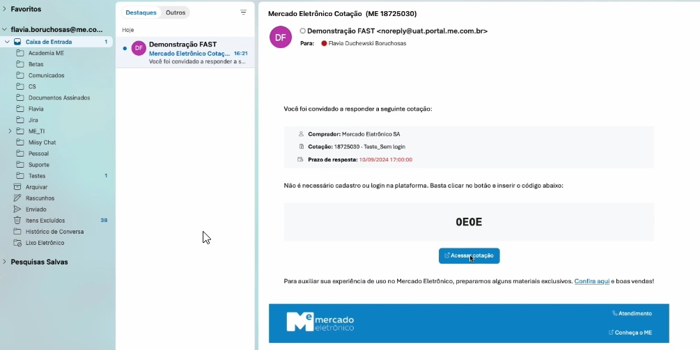 - No e-mail recebido você tem informações como, por exemplo: o número da cotação, nome do comprador e prazo para resposta.